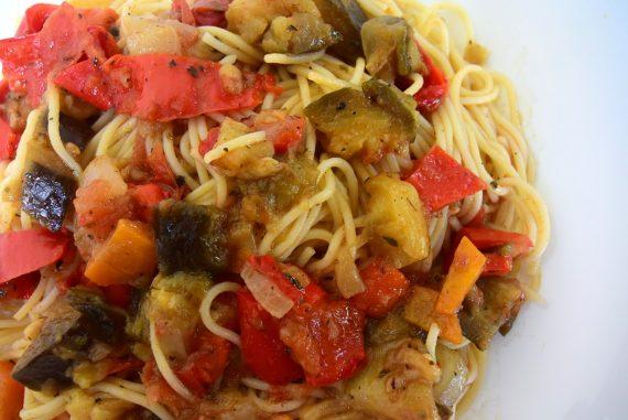 Συνταγή για μακαρόνια με λαχανικά.Μια νηστίσιμη συνταγή για μακαρόνια με μελιτζάνες, πιπεριές Φλωρίνης, σκόρδο,ντομάτα και μυρωδικά.