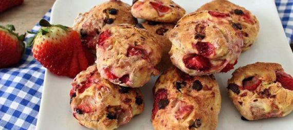 Πλένουμε τις φράουλες, τις καθαρίζουμε και τις κόβουμε σε μικρά κομμάτια. Κόβουμε και τη σοκολάτα σε μικρά κομμάτια. Σε ένα μπολ ανακατεύουμε το αλεύρι με το αυγό, τη ρικότα και τη ζάχαρη.