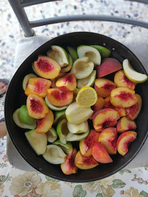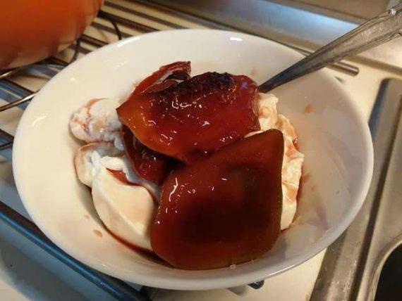 Ψητά ροδάκινα και αχλάδια δικής μας παραγωγής με κρασί και μέλι, τρώγονται από το ψυγείο με δροσερό γιαούρτι η παγωτό βανίλια.