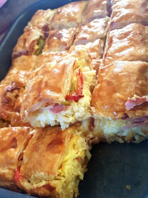 Βουτύρωσα ένα ταψάκι ορθογώνιο, έστρωσα το ένα φύλλο σφολιάτας,έριξα από πάνω τα βρασμένα μακαρόνια ,και μετά ότι σας αρέσει……,εγώ έβαλα γκούντα ρεγγατο και παρμεζάνα,έκοψα κομμάτια το ζαμπόν,τις πιπεριές, έριξα τις κρέμες γάλακτος και τα χτυπημένα αβγά,σκέπασα με το δεύτερο φύλλο σφολιάτας έκλεισα καλά τις άκρες γύρω γύρω, χάραξα ελαφρά με μαχαίρι τη σφολιάτα άλειψα με ένα αβγό,και έψησα στον αέρα στους 190 βαθμούς μέχρι να ροδίσει καλά η σφολιάτα.
