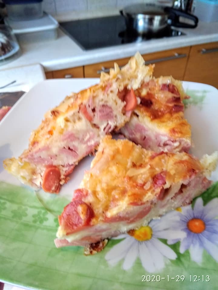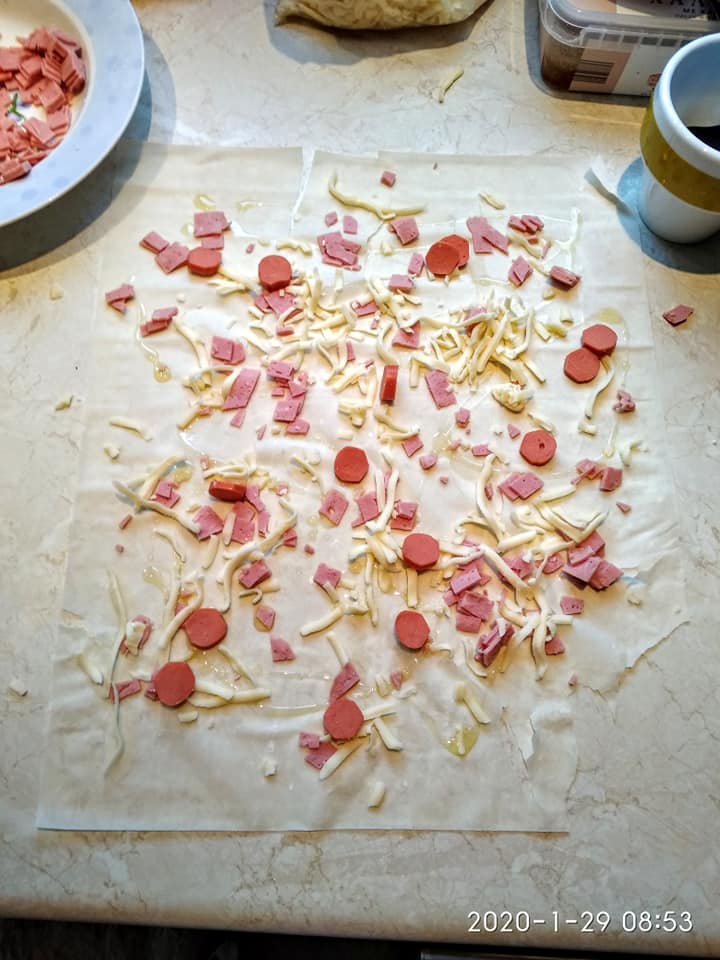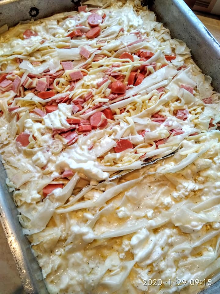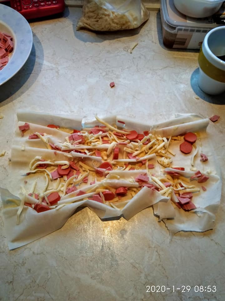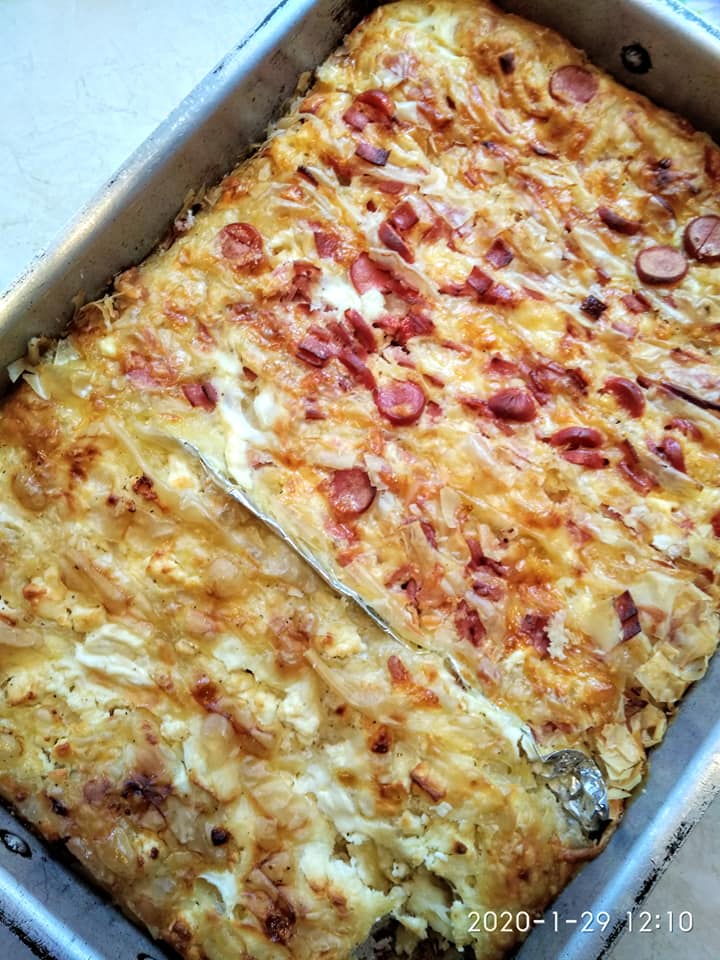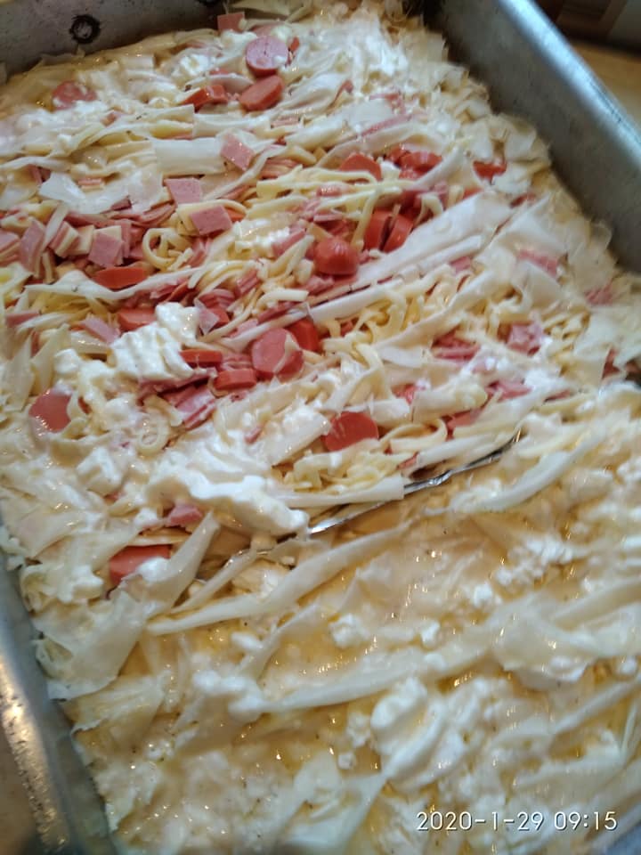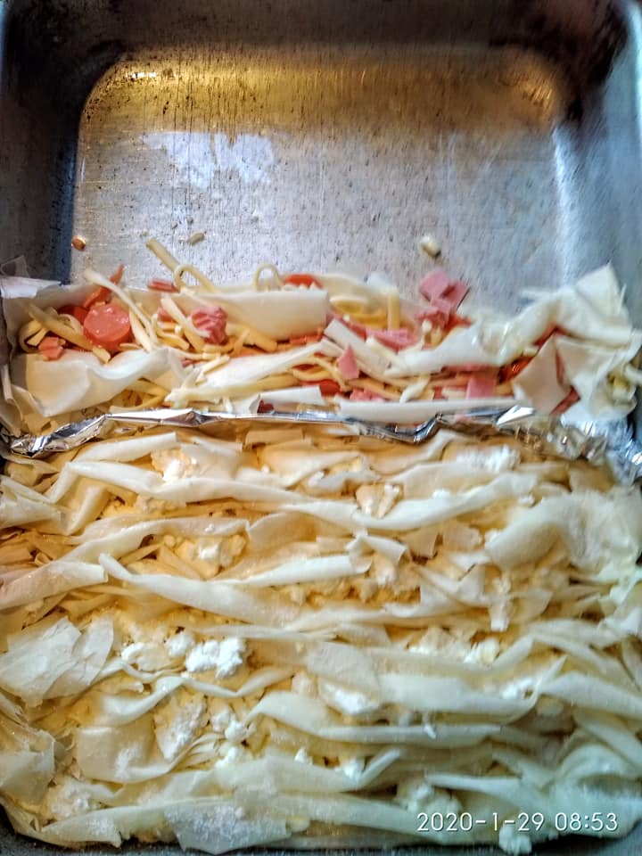 Λαδώνω καλά το ταψί. Ραντίζω τα φύλλα με το λάδι βάζω την γέμιση (στο μισό ταψί βάζω φέτα και στο άλλο μισό κασέρι ζαμπόν και λουκάνικα Φρανκφούρτης) και τα σουρώνω στο μισό ταψί που έβαλα φέτα πασπάλισα τα φύλλα με ζάχαρη (γίνεται φανταστικό ,όχι γλυκό μην το φοβηθείτε). Αφού τα στήσω στο ταψί μετά περιχύνω το γάλα με τα αυγά. Ψήνω 190 βαθμούς για περίπου 50 λεπτά