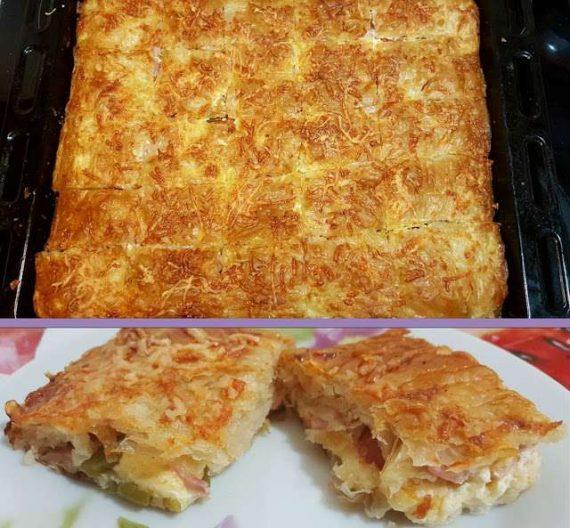 Λιώνουμε το βούτυρο και βουτυρώνουμε ένα ταψί. Στρώνουμε τα μισά φύλλα βουτυρώνοντας καλά. Βάζουμε όλα τα υλικά με την σειρά (εκτός το γάλα και τα αυγά), κρατάμε λίγο ρεγκάτο για το τέλος. Καλύπτουμε με τα υπόλοιπα φύλλα βουτυρώνοντας καλά και κόβουμε σε κομμάτια την πίτσα. Χτυπάμε τα αυγά μαζί με το γάλα και περιχύνουμε την πίτσα μας. Τέλος πασπαλίζουμε με το τυρί που κρατήσαμε, ενώ αν θέλουμε πασπαλίζουμε και με σουσάμι. Αφήνουμε για 10 λεπτά να απορροφηθούν τα υγρά και ψήνουμε σε προθερμασμένο φούρνο στους 180 βαθμούς για 45 λεπτά περίπου, μέχρι να ροδίσει καλά (ανάλογα τον φούρνο μας)