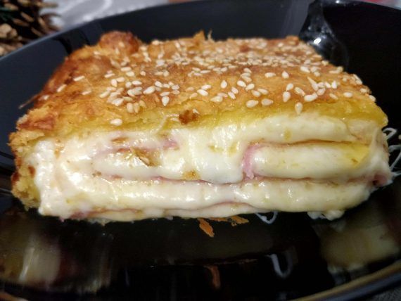 Παίρνουμε ένα πυρέξ και βάζουμε το ένα φύλλο σφολιάτας Ρίχνουμε από πάνω σχεδόν 4 κουταλιές από την κρέμα να απλωθεί σε όλο το φύλλο καλά. Ρίχνουμε από πάνω τα τυριά και μετά από πάνω το ζαμπόν και ξανακάνουμε πάλι την ίδια διαδικασία μέχρι να μας τελειώσουν τα υλικά μας. Ρίχνουμε από πάνω στο τέλος το άλλο φύλλο σφολιάτας χτυπάμε το αυγό και το ρίχνουμε πάνω στο φύλλο. Εγώ έριξα από πάνω και σουσάμι το βάζουμε στο φούρνο στους 180 βαθμούς για 30 λεπτά