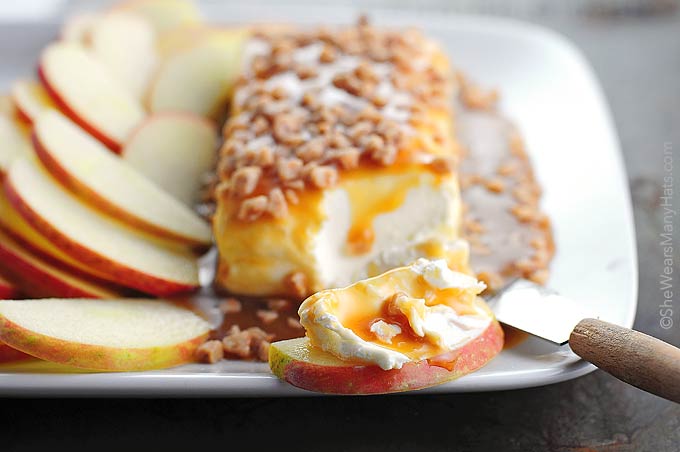 Τρία συστατικά, συν περίπου τρία λεπτά είναι το μόνο που χρειάζεστε για να το ετοιμάσετε. Φυσικά θα χρειαστεί περισσότερο χρόνο για να κόψετε τα μήλα ή αχλάδια ή ό,τι άλλο θέλετε να σερβίρετε. Ξεκινήστε με λίγο τυρί κρέμα,στη συνέχεια πασπαλίστε το με σάλτσα καραμέλας (σπιτική ή αγοράστε τη από ένα κατάστημα), και μετά πασπαλίζουμε με ένα γενναιόδωρο ποσό από κομματάκια από καραμέλες βουτύρου . Αυτό είναι τόσο απλόνα γίνει. Αλλά μην αφήνετε την απλότητα αυτού του εύκολου γλυκού να σας ξεγελάσει. Είναι τόσο τέλειο γλυκό. Θα δείτε. Σας το υπόσχομαι.