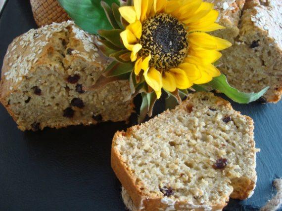 Βουτυρώνουμε και αλευρώνουμε μια μακρόστενη φόρμα του κέικ με διαστάσεις 10×20 εκ. και αδειάζουμε μέσα το μείγμα. Πασπαλίζουμε την επιφάνεια με επιπλέον νιφάδες βρόμης. Ψήνουμε στον προθερμασμένο φούρνο για 60 λεπτά μέχρι να ροδίσει καλά ελέγχοντας πάντα με ένα μαχαίρι εάν έχει ψηθεί στο κέντρο, αν όχι ψήνουμε ακόμα λίγη ώρα. Ξεφορμάρουμε και το αφήνουμε να κρυώσει .