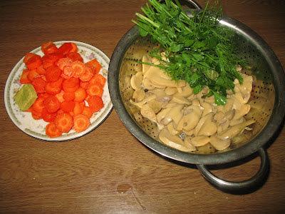 Τα τοποθετούμε σε μέτρια κατσαρόλα με το μαιντανό και το άνηθο ψιλοκομμένα και το κύβο κότας λιωμένο σε ένα ποτήρι νερό,προσθέτουμε άλλο μισό ποτήρι νερό σκεπάζουμε την κατσαρόλα και μαγειρεύουμε σε μέτρια φωτιά για 1 ώρα μέχρι να μαλακώσουν και να εξατμιστεί το νερό . Εν τω μεταξύ ψήνετε τα κομμάτια του κοτόπουλου ,η,στή σχάρα ,η στο γκρίλ κι όταν ροδίσει το ρίχνουμε στην κατσαρόλα με τα λάχανικά και τα μανιτάρια ,προσθέτοντας και το ζουμάκι από την μαρινάδα . Γιά να πήξει λίγο το ζουμάκι στο τέλος του μαγειρέματος ,βάζουμε 1 κουταλιά κοφτή αλεύρι σε λίγο νερό ,το διαλύουμε καλά και το ρίχνουμε μέσα στο φαγητό .κουνάμε την κατσαρόλα . Τα αφήνετε να πάρουν 3-4 βράσεις και το κατεβάζετε από την φωτιά .