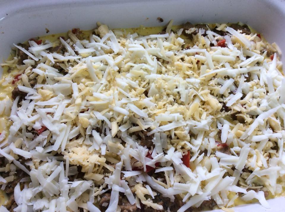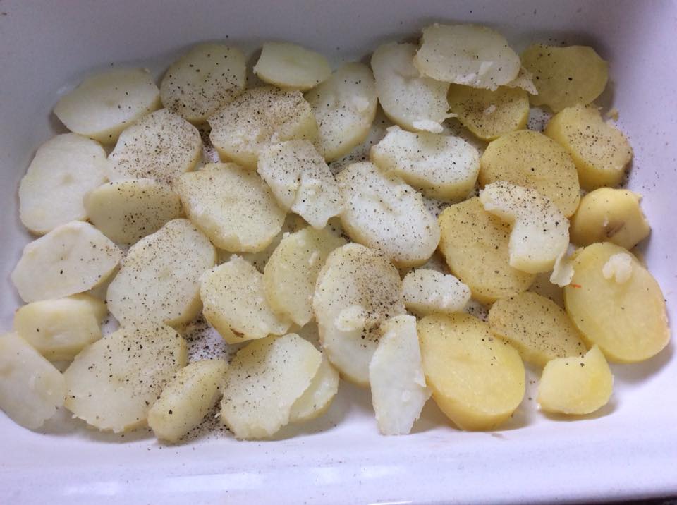 Τοποθετώ τις φέτες βρασμένης πατάτας σε ταψάκι και ρίχνω και λίγο τυρί. Σόταρα τις πιπεριές και το κρεμμύδι σε λάδι και μετά έριξα και τα μπιφτέκια. Πρόσθεσα λίγο ούζο και περίμενα να εξατμιστεί. Μετά τα έβαλα πάνω από τις πατάτες. Τέλος έριξα πάνω τους,τα αυγά χτυπημένα με το γάλα, λίγο πιπέρι, ελάχιστο αλάτι και τριμμένο τυρί. Έψησα σε μέτριο φούρνο, για μισή ώρα σκεπασμένο με αλουμινόχαρτο. Κατόπιν, άνοιξα το αλουμινόχαρτο να πάρει χρώμα, αφού έβαλα και λίγες φέτες ντομάτας. Έγινε πεντανόστιμο. Εσείς αν δεν θέλετε, δεν βάζετε ούζο. Αντί για γάλα μπορείτε να βάλετε κρέμα γάλακτος, ή να φτιάξετε μπεσαμέλ. Επίσης, νομίζω ότι και τηγανητές να είναι οι πατάτες πάλι ωραίο θα είναι. Φτιάξτε το με τα υλικά που σας αρέσουν, και με αυτά που έχετε σπίτι, εννοείται.