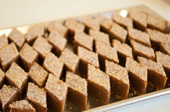 Όταν κρυώσει εντελώς -μετά από δυο ώρες και παραπάνω- κόβουμε τα κομμάτια, τους ρόμβους που έχουμε κόψει πριν το ψήσιμο και τους ξεχωρίζουμε βάζοντας τα κομμάτια σε στρώσεις -δυο τρεις το πολύ-σε πιατέλες.