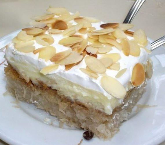 Μόλις πήξει η σαντιγί, είναι έτοιμη. Την απλώνουμε πάνω στην κρέμα, πασπαλίζουμε με το τριμμένο καρύδι, βάζουμε το γλυκό στο ψυγείο για 2-3 ώρες και μετά σερβίρουμε.