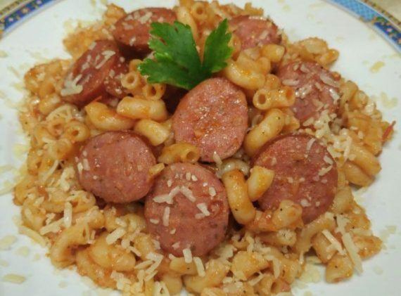 Εκτέλεση Βάζουμε στην κατσαρόλα λίγο ελαιόλαδο και τσιγαρίζουμε το κρεμμύδι ψιλοκομμένο με τα λουκάνικα σε ροδέλες. Έπειτα τις ντομάτες τριμμένες στον τρίφτη, νερό αλάτι και πιπέρι. Αφήνουμε να βράσει πέντε λεπτά και μετά ρίχνουμε το μακαρονάκι. Ανακατεύουμε, σβήνουμε το μάτι και το αφήνουμε να φουσκώσει μόνο του.