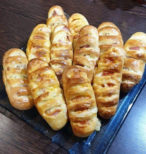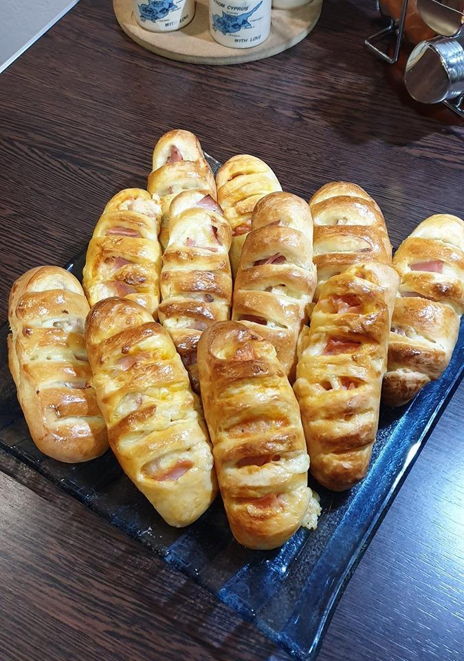 Για την γέμιση στα μισά έβαλα λουκάνικο από κοτόπουλο, κέτσαπ, μουστάρδα Και στα υπόλοιπα ζαμπόν, τυρί, κέτσαπ….