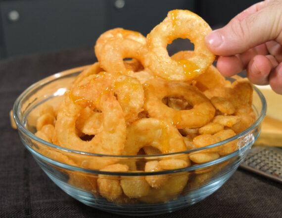 Την αφήνουμε να ξεκουραστεί για 15 λεπτά. Ανοίγουμε την ζύμη σε ένα μεγάλο φύλλο και με ένα κουπάτ ή ποτήρι κόβουμε σε μικρά στρόγγυλα κυκλάκια και με ένα μικρότερο κάνουμε τρύπα στην μέση. Τηγανίζουμε με ηλιέλαιο μέχρι να πάρουν χρυσαφί χρώμα.