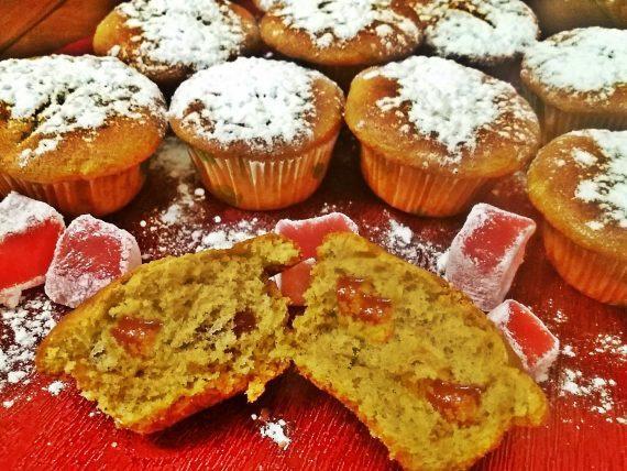 Με ένα κουτάλι βάζουμε στις θήκες για μάφιν τη ζύμη, κόβουμε κάθε λουκούμι σε 3 ή 4 κομμάτια, βυθίζουμε απαλά 2-3 κομμάτια λουκούμι σε κάθε φορμάκι και τα ψήνουμε για περίπου 15 – 20 λεπτά.