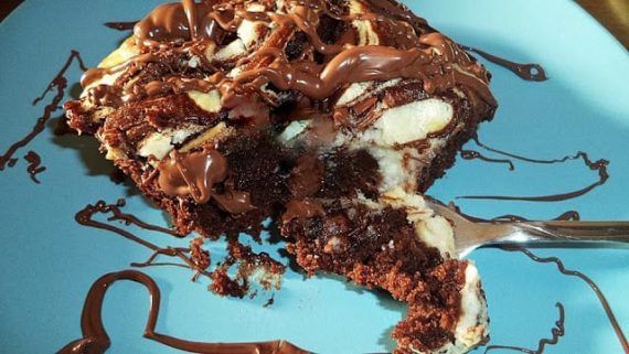 ΕΚΤΕΛΕΣΗ -Βάζω όλα μαζί τα υλικά σ’ ένα μπολ και τα ανακατεύω με μια κουτάλα να ενωθούν καλά.Δε χρειάζεται μίξερ. Αδειάζω το μείγμα σε βουτυρωμένο ταψάκι μέτριο 24Χ34 περίπου. Σ’ ένα άλλο μπολάκι ανακατεύω το τυρί κρέμα με την άχνη και τη βανίλια και το βάζω στα μικροκύματα για 20 περίπου δευτερόλεπτα να ρευστοποιηθεί.(ΠΡΟΣΟΧΗ ΟΧΙ ΠΑΡΑΠΑΝΩ!) Ρίχνω κουταλιές από τη λευκή κρέμα πάνω από το σοκολατένιο μίγμα και ρίχνω και την Μερέντα εδώ κι εκεί. Μ’ ένα μαχαίρι κάνω κύκλους στο μείγμα για να δημιουργήσω τα ”νερά”και να γίνει δίχρωμο το μπράουνι. Ψήνω στους 180 για 25 λεπτά μόνο! Όσο κάθεται γίνεται όλο και πιο ζουμερό!