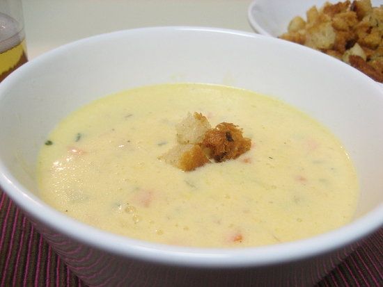 Τα υλικά 1 lt. ζωμό κότας ή βοδινού 600 gr. τυρί κρέμα 200 gr. αρακά 200 gr. καλαμπόκι 100 gr. καρότα baby 1 κρεμμύδι Κόκκινο πιπέρι Αλάτι Μπέικον ξεροψημένο Τσένταρ