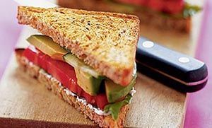 2 κουταλιές της σούπας μαγιονέζα χωρίς λιπαρά Φέτες ψωμί ολικής αλέσεως με λιναρόσπορο ή ολικής φρυγανισμένες 4 μεγάλα φύλλα μαρούλι 1 μεγάλη ώριμη ντομάτα, κομμένη σε λεπτές φέτες 1 αβοκάντο ξεφλουδισμένο και κομμένο σε φέτες 12 πολύ λεπτές φέτες αγγούρι Φέτες τυρί με χαμηλά λιπαρά