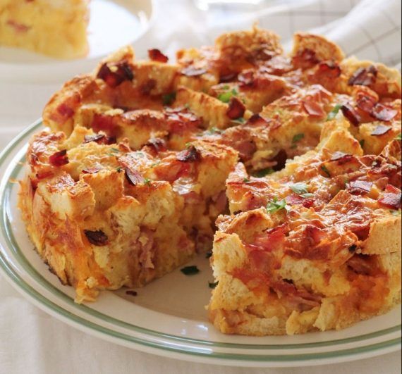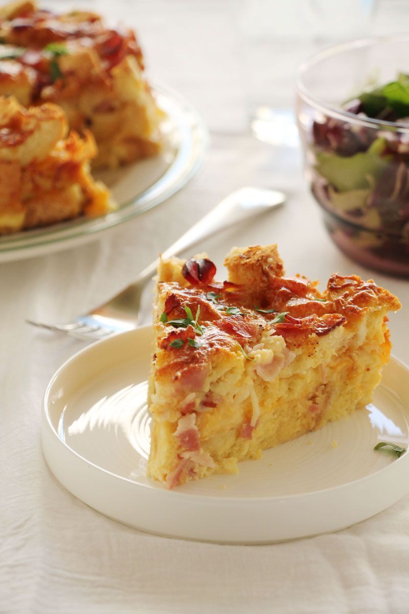 τραγανή χρυσαφένια κρούστα και ωραία, ζουμερή υφή. Να σας πω ότι η γεύση της είναι κάτι ανάμεσα σε σουφλέ, ομελέτα, πουτίγκα με ψωμί και τάρτα. Να σας παροτρύνω να την ετοιμάσετε μιας που είναι πανεύκολη και χρειάζεστε μόνο αυγά, ψωμί, γάλα και τη φαντασία σας σε σχέση με τα τυριά, τα αλλαντικά ή και τα λαχανικά που θα επιλέξετε. Να τονίσω ότι μπορείτε να την ετοιμάσετε από την προηγούμενη ημέρα και να τη διατηρήσετε στο ψυγείο μέχρι τη στιγμή που θα την ψήσετε (πόσο βολική για ένα παιδικό πάρτι). Και τέλος να πω ότι είναι ιδανική για πρωινό, brunch, μεσημεριανό γεύμα και βραδινό, αλλά και για το σπίτι, το γραφείο, το σχολείο και το πάρτι.