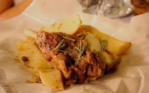 Εκτέλεση: Κόβουμε κυδωνάτες τις πατάτες και σε κυβάκια το σκόρδο και το τυρί. Αλατοπιπερώνουμε το κρέας, και αλείφουμε με την μουστάρδα. Ρίχνουμε το θυμάρι και το δεντρολίβανο. Το τοποθετούμε στη λαδόκολλα , το μαζεύουμε σε πουγκί και το δένουμε. Ραντίζουμε με λίγο νερό την λαδόκολλα και το ψήνουμε στους 220 βαθμούς για λίγο λιγότερο από 1 1/2 ώρα.