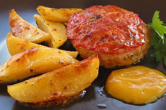 Σκορπίστε τις πατάτες ανάμεσα στα μπιφτέκια. Ακουμπήστε φέτες ντομάτας πάνω στα μπιφτέκια (αν θέλετε). Περιχύστε με ελαιόλαδο και πασπαλίστε με λίγο αλάτι.