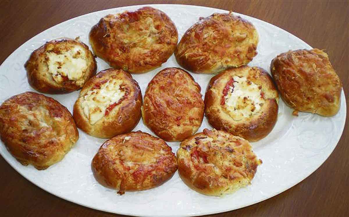 Ζεσταίνω ελαφριά το γάλα και διαλύω τη ζάχαρη και τη μαγιά. Ζυμώνω όλα τα υλικά μαζί για 7 λεπτά μέχρι να πάρω ένα εύπλαστο ζυμάρι το οποίο θα σκεπάσω και θα αφήσω να φουσκώσει για 1 περίπου ώρα. Θα το πατήσω με τα χέρια μου και θα το χωρίσω σε μικρές μπαλίτσες στο μέγεθος αβγού. Ανοίγω το κάθε μπαλάκι πατώντας το με την παλάμη μου και βάζω μέσα τη γέμιση που έχω δημιουργήσει ανακατεύοντας τα υλικά. Το πιάνω, το τραβώ και το τσιμπώ με τα δάχτυλά μου έτσι ώστε να σχηματίσω μικρές γόνδολες. Αφήνω σε ταψί στρωμένο με χαρτί ψησίματος για 15-20 λεπτά να φουσκώσουν πάλι. Περνώ με αβγό και ψήνω στους 190 βαθμούς για μισή ώρα.