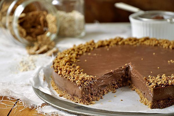 - Απλώνουμε την κρέμα σοκολάτας πάνω στη βάση και βάζουμε την τούρτα στο ψυγείο τουλάχιστον για δύο ώρες για να σφίξει και να σταθεροποιηθεί. Γαρνίρουμε πασπαλίζοντας την επιφάνεια με το μείγμα της βάσης που έχουμε κρατήσει. Μ’ ένα μαχαίρι ξεκολλάμε περιμετρικά την τούρτα από τα τοιχώματα και ξεφορμάρουμε. Πριν σερβίρουμε, αφήνουμε την τούρτα για 5−10 λεπτά εκτός ψυγείου.