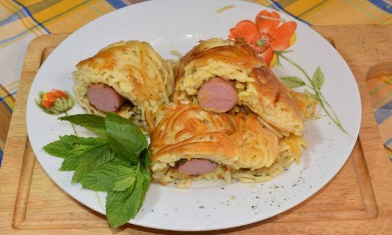Αλάτι 1/2 κιλό μακαρόνια νούμερο 6 spaghetti 2 αβγά 200 γραμμάρια γραβιέρα 1 κ.σ. φυτικό βούτηρο για το τηγάνισμα Προαιρετική γέμιση Λίγη μουστάρδα 5 βραστά λουκάνικα Λίγη ρίγανη