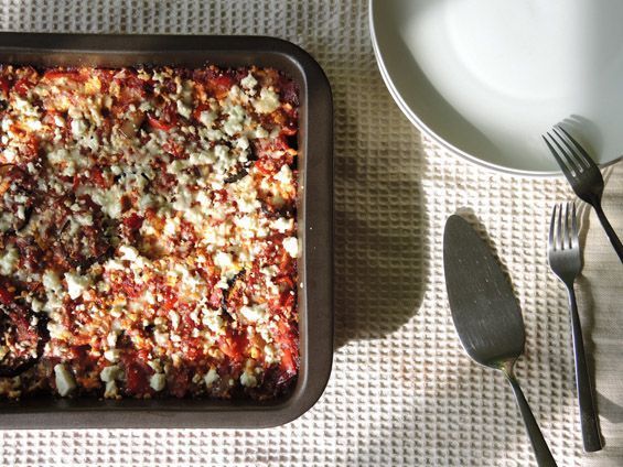 - Λαδώνουμε ένα ορθογώνιο, πυρίμαχο ταψάκι και στρώνουμε τις ψημένες μελιτζάνες σε μια στρώση.