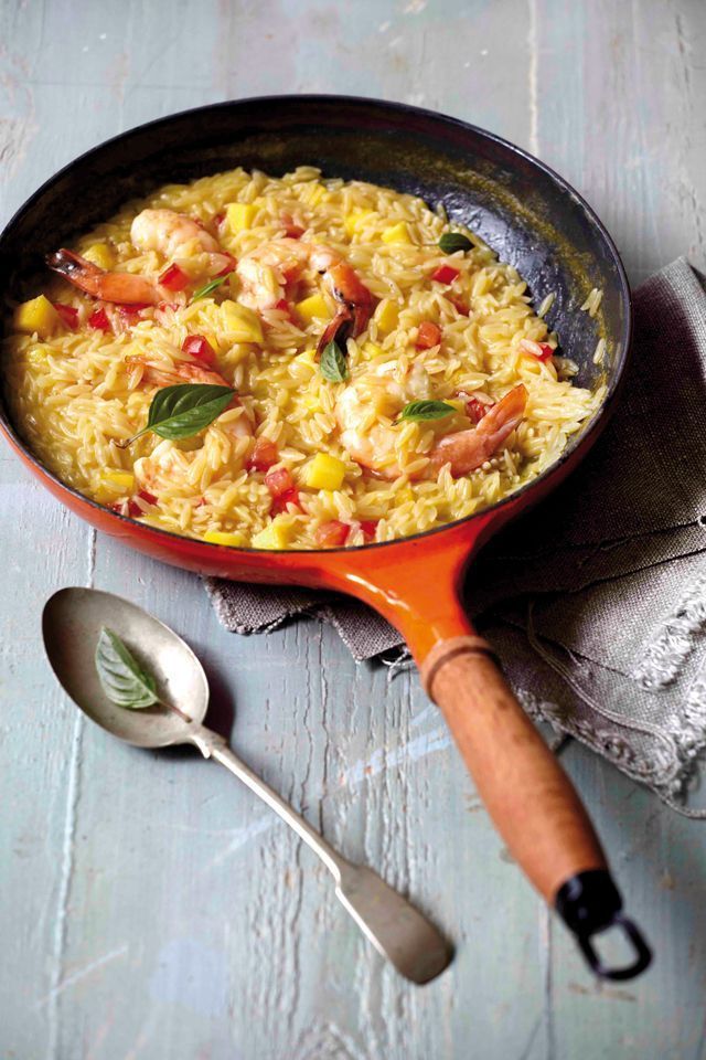 Υλικά -500 γρ. κριθαράκι -6 πορτοκάλια καθαρισμένα κομμένα σε φέτες -1 λάιμ καθαρισμένο κομμένο σε φέτες -1 λεμόνι καθαρισμένο κομμένο σε φέτες -1 μάνγκο κομμένο σε καρεδάκια -1 ντομάτα κομμένη σε καρεδάκια -½ φλιτζάνι ελαιόλαδο -4+4 φύλλα βασιλικού φρέσκου -8 γαρίδες μεσαίου μεγέθους καθαρισμένες -3 ποτήρια ζωμό κότας -αλάτι, πιπέρι