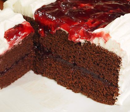 Υλικά συνταγής για το κέικ: Αλεύρι: 265 γρ. Ζάχαρη: 2 κούπες (400 γρ.) Κακάο: 65 γρ. Μπέικιν πάουντερ: 1 1/2 κουταλάκι τσαγιού Μαγειρική σόδα: 3/4 κουταλάκι τσαγιού Αλάτι: 3/4 κουταλάκι τσαγιού Ελαφρά χτυπημένα αυγά: 3 μεγάλα Ηλιέλαιο: 1/2 κούπα (125 ml) Γάλα: 1 κούπα (250 ml) Εκχύλισμα βανίλιας: 1 κουταλάκι τσαγιού (ή 2 κάψουλες βανιλίνη) Υλικά συνταγής για τη γέμιση και επικάλυψη: Βύσσινο μαρμελάδα: 1 κούπα Λικέρ: 1/2 κούπα (βύσσινο ή κεράσι) Κρέμα γάλακτος: 400 ml Άχνη Ζάχαρη: 5 κουταλιές σούπας Εκχύλισμα βανίλιας: 1/2 κουταλάκι τσαγιού (ή 1 κάψουλα βανιλίνη)