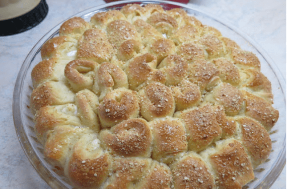 Αφήνουμε να διπλασιαστεί σκεπασμένη 30-40 λεπτά. Παίρνουμε κομματάκια ζύμης όσο ένα καρύδι και το ανοίγουμε με τα χέρια όσο ένα πιατάκι βάζουμε λίγο βουτυράκι και τυράκι το τυλίγουμε σε ρολό και το κόβουμε στα δύο ή στα τρία ανάλογα το μέγεθος, (αυτά θα φουσκώσουν).