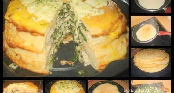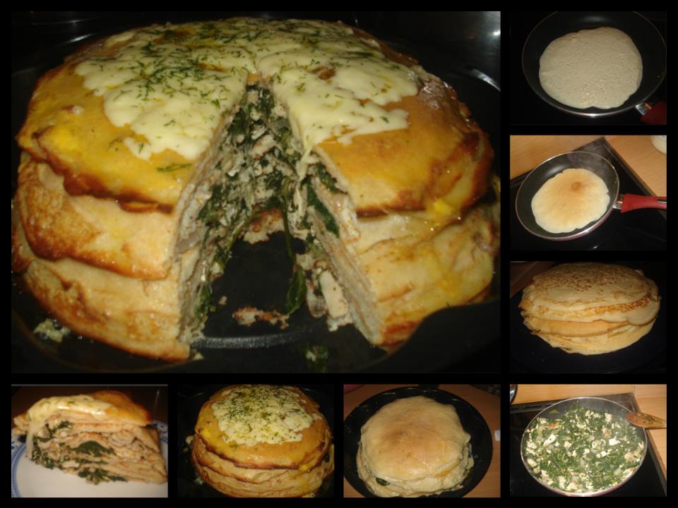 -Το στήθος το βράζουμε και το κόβουμε σε κομμάτια(χωρίς κοκάλα) Σοτάρουμε τα κομμένα κρεμμύδια μαζί με το κοτόπουλο,ρίχνουμε 1 κύβο KNORR κοτόπουλο και τα υπόλοιπα μπαχαρικά. (προαιρετικά σπανακι 300 γρ) Αφήνουμε για 5 λεπτά και σβηνουμε την φωτιά. Αφού τελειώσουμε την ετοιμασία της γέμισης και της κρέπας αρχίζουμε να φτιάχνουμε την τούρτα μας. Σε ένα πυρέξ στρώνουμε την μια κρέπα,από πάνω την γέμιση ,πάλι στρώνουμε την μια κρέπα και από πάνω την γέμιση(συνεχίζουμε να την χτίζουμε την τούρτα μας μέχρι να τελειώσουν οι κρέπες μας) Αφού τελειώσουμε χτυπάμε σε ένα πιατάκι τα αυγά με το γάλα και ρίχνουμε πανω στην επιφάνεια της τούρτας μας. Τελειωνoντας ρίχνουμε και το τριμμενο κασέρι στην κορυφή της και την βάζουμε στο φούρνο σε 180 βαθμούς για κανένα 20 λεπτά. ΚΑΛΗ ΕΠΙΤΥΧΙΑ!!!