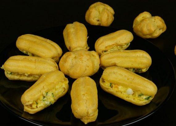 Σου: Βάζουμε το νερό μαζί με το βούτυρο και το αλάτι να βράσουν. Όταν πάρουν θερμοκρασία προσθέτουμε το αλεύρι και ανακατεύουμε να γίνει ζύμη. Η ζύμη είναι έτοιμη όταν στον πάτο της κατσαρόλας δημιουργηθεί κρούστα. Την αφήνουμε για 5 λεπτά κρυώσει και ενσωματώνουμε ένα ένα τα αυγά με την βοήθεια του μίξερ. Βάζουμε τη ζύμη σε ένα κορνέ με χοντρή οδοντωτή μύτη και σε ταψί με αντικολλητικό χαρτί “κόβουμε” τα εκλέρ. Με ένα βρεγμένο κουτάλι ισιώνουμε την ζύμη που μπορεί να προεξέχει και τα ψήνουμε στους 200 βαθμούς για 10-12 λεπτά. Κατεβάζουμε την θερμοκρασία στους 150 βαθμούς και ψήνουμε για ακόμα 20-30 λεπτά. Όταν πάρουν το χρώμα που θέλουμε κλείνουμε τον φούρνο και με μία κουτάλα κρατάμε την πόρτα του ανοιχτή, ώστε τα εκλέρ να κρυώσουν σιγά σιγά. Γέμιση: Αναμειγνύουμε όλα τα υλικά μαζί με λίγο πιπέρι μέχρι που να πάρουν την υφή αυγοσαλάτας. Κόβουμε στην μέση τα κρύα εκλέρ και γεμίζουμε.