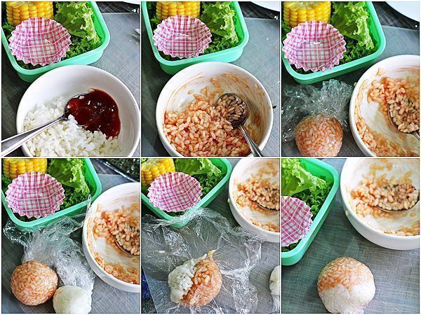 Τοποθετούμε 1 ½ κουταλιά της σούπας ρύζι σε ένα μπολ και προσθέτουμε ¾ κουταλάκι του γλυκού σάλτσα ντομάτας και ανακατεύουμε Σε πλαστική μεμβράνη κουζίνας βάζουμε περίπου 1 κουταλιά της σούπας ρύζι ντομάτας πάνω και φτιάχνουμε μια οβάλ μπάλα