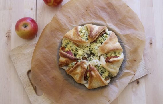 Κόβετε το σφολιατάκι σε 4 τρίγωνα, χωρίς να φτάνετε μέχρι το κέντρο. Το κέντρο πρέπει να μείνει άκοπο για να ακουμπήσετε τη γέμιση και έπειτα να το διπλώσετε όπως βλέπετε στη φωτογραφία.