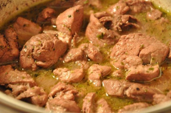 Αρχικά πλένουμε καλά το κρέας. Βάζουμε το λάδι μας σε κατσαρόλα περιμένουμε να ζεσταθεί πολύ καλά και ρίχνουμε μέσα το κρέας να σοταριστεί καλά και να θωρακίσει το υγρά του (το κρέας αλλάζει χρώμα, γίνεται άσπρο). Σβήνουμε με το κρασί και προσθέτουμε νερό τόσο όσο χρειάζεται για να μισοσκεπάσουμε το κρέας. Μόλις πάρει μια βράση, προσθέτουμε το αλάτι, σκεπάζουμε την κατσαρόλα, χαμηλώνουμε σε χαμηλή προς μέτρια φωτιά και μαγειρεύουμε το φαγητό μέχρι να εξατμιστούν όλα τα υγρά και να μείνει μόνο με το λάδι. Προσθέτουμε πιπέρι και ρίγανη. Ανακατεύουμε καλά και τέλος ρίχνουμε το χυμό του λεμονιού.