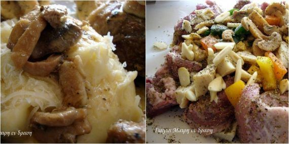 Χοιρινό με μανιτάρια στην λαδόκολλα υλικά 1500 γραμ χοιρινή σπάλα 200 γραμ κεφαλοτύρι σε κύβουw 1 κονσέρβα μανιτάρια σε φέτες 1 πιπεριά κομμένη 3 σκελίδες σκόρδο 4 κσ μουστάρδα ρίγανη αλάτι πιπέρι εκτέλεση κόβουμε σε μερίδες και πλένουμε καλά, αφήνουμε να στραγγίσει το κρεατάκι μας ετοιμάζουμε τα υπόλοιπα υλικά μας σε μια λεκανίτσα και τέλος βάζουμε και το κρέας και αλατοπιπερώνουμε καλά!!! 4 κσ μουστάρδα μας κάνουμε ένα μεγάλο σταυρό με αλουμινόχαρτο και από πάνω έναν με λαδόκολλα και ριχνουμε όλα τα υλικά μας πάνω στην λαδόκολλα και τα κάνουμε ένα δεματάκι κλείνοντας καλά μια από την μια μεριά και μετά από την άλλη και το βάζουμε σε ένα ταψάκι περίπου ίδιο μέγεθος με το δεματάκι μας!!! το ψήνουμε στους 180 με 200 για 2 1/2 ώρες χωρίς να το κουνήσουμε και χωρίς να βάλουμε νερά στο ταψί!!! τέλος με ένα μαχαίρι κόβουμε σταυρωτά το αλουμινόχαρτο και την λαδόκολλα και ανοίγουμε το φαγάκι μας να πάρει χρώμα και να φύγουν τα πολλά υγρά που μπορεί να έχει στο δεματάκι μας! Μπορείτε να φτιάξετε τέτοια δεματάκια η’ και ατομικά και να τα έχετε στον καταψύκτη σας έτοιμα και όταν τα χρειαστείτε να τα βάλετε πρώτα μια ώρα στους 150 και μετά να αρχίσετε την διαδικασία ψησίματος!!!