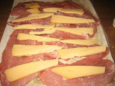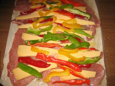 1 κιλό σνίτσελ χοιρινά 4 φύλλα κρούστας 1 κόκκινη πιπεριά κομμένο σε μακρόστενα κομμάτια 1 πράσινη πιπεριά 1 κίτρινη πιπεριά τυρί γκούντα κομμένο σε λωρίδες μακρόστενες αλάτι πιπέρι λίγο ελαιόλαδο Μπέικον [προαιρετικά ]