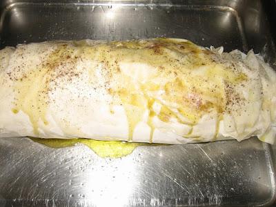 Οταν ψηθούν και τα δύο τοποθετούμε το ρολό στο ταψί να σερβίρουμε αν θέλουμε.