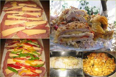 ΠΡΟΣΟΧΗ Τις πατατούλες τις ψήνουμε μόνες τους σε άλλο ταψάκι ,για να συνοδέψουν το ρολό δεν μπαίνουν όλα μαζί γιατί θα μουλιάσει το φύλλο .
