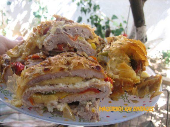 Αλατοπιπερώνουμε τα σνίτσελ Στρώνουμε σε μία επιφάνεια τα 2 φύλλα κρούστας τοποθετούμε τα σνίτσελ στην σειρά ομοιόμορφα [με γρήγορες κινήσεις μην μουλιάσει και μας ανοίξει το φύλλο,αν μας συμβεί αυτό το τυλίγουμε σε ρολό ,και προσθέτουμε άλλα 2 φύλλα απ΄έξω ,το ξανατυλίγομαι δηλαδή] Στρώνουμε από πάνω τις πιπεριές ομοιόμορφα και το τυρί μας και τυλίγουμε σε ρολό .αν μας ανοίξει κάντε αυτό που σας είπα παραπάνω . Το τοποθετούμε σε ταψί,το περιχύνουμε με λίγο λάδι,το σκεπάζουμε με λαδόκολλα και το ψήνουμε σε μέτριο φούρνο για 2 ώρες περίπου . Συνοδεύουμε με ότι μας αρέσει ,και οταν ψηθεί και κρυώσει το κόβουμε φετούλες .