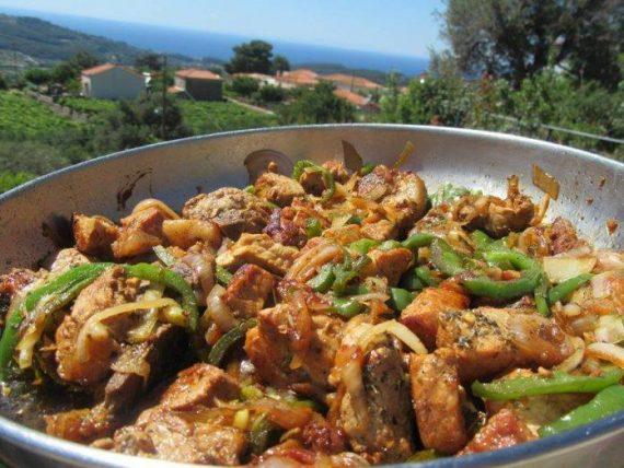 Κόβω σε μικρά κομμάτια 3 πολύ μεγάλα κρεμμύδια σε ροδέλες, 2 μεγάλες πιπεριές, αλάτι, πιπέρι, ρίγανη, θυμάρι. Τα βάζω στο τηγάνι μαζί και το κρέας σε κομματάκια κομμένο χωρίς λάδι περιμένω 10-15 λεπτά να απορροφηθούν όλα τα υγρά τους και να μαραθούν κρεμμύδια και πιπεριές και μετά ρίχνω το λάδι, Μόλις καραμελώσουν τα κρεμμύδια μου και ψηθεί το κρέας μου σβήνω με το κρασί μου περίπου μισό ποτ του κρασιού και μόλις εξατμιστεί το κρασί μου σβήνω με τον χυμό από 2 λεμονιά. Σε 3 λεπτά σερβίρω..!! Είναι πολύ απλή και νόστιμη τηγάνια δοκιμάστε την..!!