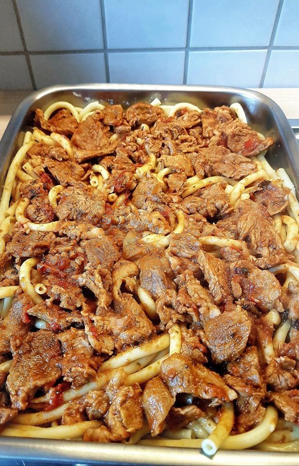 Βάζω το λάδι να καίει κ σοτάρω το κρέας. Προσθέτω το κρεμμύδι το σκόρδο.κ την πιπεριά. Ρίχνω κ το κρασί έως να εξατμιστεί καλά. Στη συνέχεια ρίχνω τον ντοματοχυμο με τον πελτέ μαζί + 3 ποτήρια ζεστό νερό..ρίχνω το αλατοπίπερο κ τα δαφνόφυλλο κ σιγοβράζω για 2 ώρες περίπου έως να δέσει καλά η σάλτσα.(αν χρειαστεί προσθέτουμε λίγο μεράκι ακόμη). Παράλληλα αραδιάζω τα μακαρόνια..τα σουρώνω τα απλώνω στο ταψί κ απλώνω το κοκκινιστό το κρέας.. Φυσικά με τριμμένο τυρί είναι σκέτη απόλαυση!!