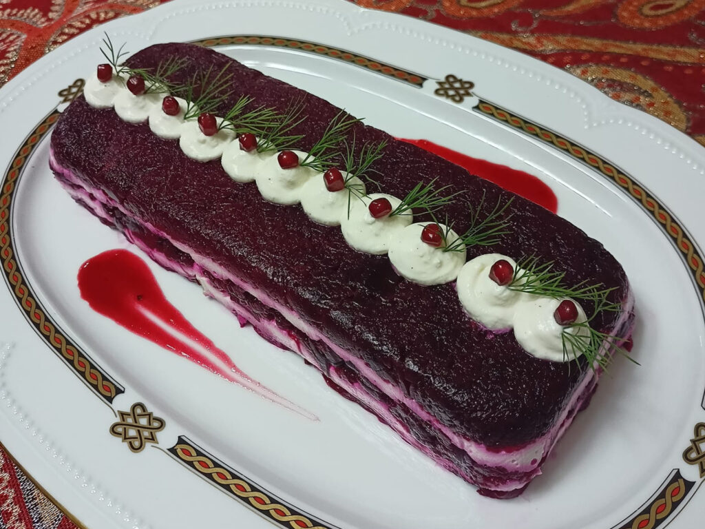Δείτε παρακάτω την εκτέλεση για την Χριστουγεννιάτικη σαλάτα τούρτα με παντζάρι: