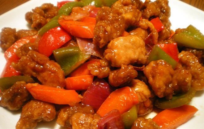 Αδειάζετε το λάδι και σκουπίζετε το γουόκ με απορροφητικό χαρτί. Το επιστρέφετε στη φωτιά. Βάζετε μια κουταλιά λάδι στο γουόκ και σοτάρετε το κρεμμύδι, να μαλακώσει. Προσθέτετε τις πιπεριές και το σέλινο και συνεχίζετε το σοτάρισμα. Όταν μαλακώσουν, ρίχνετε τη σόγια σος, τον ντοματοπελτέ ή τον συμπυκνωμένο χυμό ντομάτας, το ξίδι, το ζωμό βοδινού και το χυμό του ανανά με το κορν φλάουερ και ανακατεύετε το μίγμα μέχρι να βράσει και να πήξει ελαφρά.