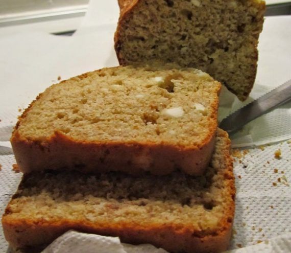Σε ένα μεγάλο μπολ ανακατεύουμε όλα τα υλικά μαζί.Ψήνουμε σε μακρόστενη φόρμα ψωμιού με λαδόκολλα,στους 160 βαθμούς,στον αέρα,σε προθερμασμένο φούρνο,για μία ώρα περίπου(κάνουμε στα 45 λεπτά το τεστ με το μαχαίρι,όπως με το κεικ).Αφήνουμε 10 λεπτά στη φόρμα και βάζουμε σε σχάρα να κρυώσει.