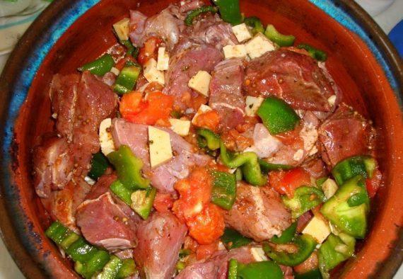 500 γραμμ. μοσχαρίσιο κρέας, κομμένο σε μέτριους κύβους,αν θέλετε μπορείτε να προσθέσετε και χοίρινο 500 γραμμ. αρνί, κομμένο σε μέτριους κύβους 1 κύβος ζωμού λαχανικών διαλυμένος σε 1½ ποτήρι ζεστό νερό 450 γραμμ. πράσινες και κόκκινες πιπεριές, κομμένες σε μέτρια κομμάτια 2 μέτρια κρεμμύδια ψιλοκομμένα