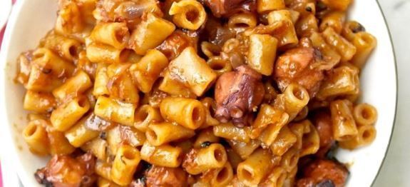 Αν περισσέψει, προσθέτουμε μισή κούπα νερό στην κατσαρόλα μας και το ζεσταίνουμε. Παρατηρήσεις: 1)Για να καθαρίσουμε τα χταπόδια πρέπει να βγάλουμε το στόμα τους (είναι σαν ράμφος) , και τα μάτια τους. Επίσης πρέπει να σκίσουμε τη σακούλα τους και να καθαρίσουμε το εσωτερικό της από εντόσθια και άμμο. Τα πλένουμε πολύ καλά. Πολλές φορές συγκρατούν άμμο ακόμη και στις βεντούζες τους.2)Το αρχικό βράσιμο του χταποδιού μπορεί να γίνει σε χύτρα ταχύτητας. Τότε δεν χρειάζεται νερό , αρκεί το κρασί και τα υγρά που θα βγάλει το χταπόδι. 3)Αν μας «ξεφύγει» ο χρόνος και παραβράσει το χταπόδι, πρωτοβράζουμε τη σάλτσα σκέτη και μετά προσθέτουμε τα ανάλογα υγρά. Προσθέτουμε το χταπόδι όταν έχει μισοβράσει το μακαρονάκι ή μαζί με το μακαρονάκι.