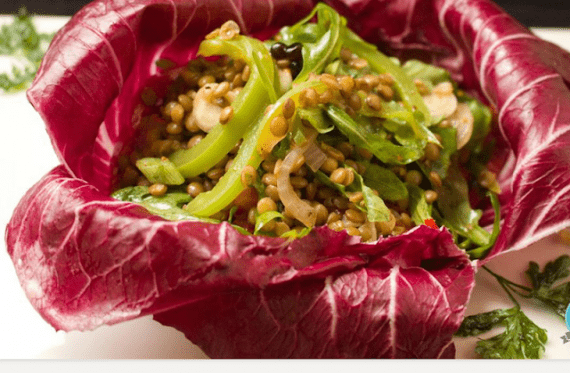 Τι κάνουμε Μουλιάζουμε από βραδύς τις φακές. Σε μια μέτρια κατσαρόλα με αρκετό νερό που βράζει ρίχνουμε τη ροδέλα κρεμμυδιού, τα κλωναράκια μαϊντανού και τη μία σκελίδα σκόρδο. Προσθέτουμε τις φακές, χαμηλώνουμε τη φωτιά και σιγοβράζουμε για περίπου 30΄. Προσέχουμε να παραμείνουν τρυφερές. Τις στραγγίζουμε . Σε μια μικρή κατσαρόλα ανακατεύουμε το λάδι, το ξίδι, τη μουστάρδα και τη μία σκελίδα σκόρδο που μας έχει μείνει. Φροντίζουμε το μείγμα απλώς να ζεσταθεί, όχι να βράσει. Τοποθετούμε τις χλιαρές φακές σε ένα μπολ και προσθέτουμε το ψιλοκομμένο κρεμμύδι, το μαϊντανό και τη βινεγκρέτ την ρόκα την πιπεριά Αλατοπιπερώνουμε και σερβίρουμε πάνω στα φύλλα ραντίτσιο ή σε φύλλα κόκκινου λάχανου ή σε σαλατιέρα !!! Καλή απόλαυση !!!