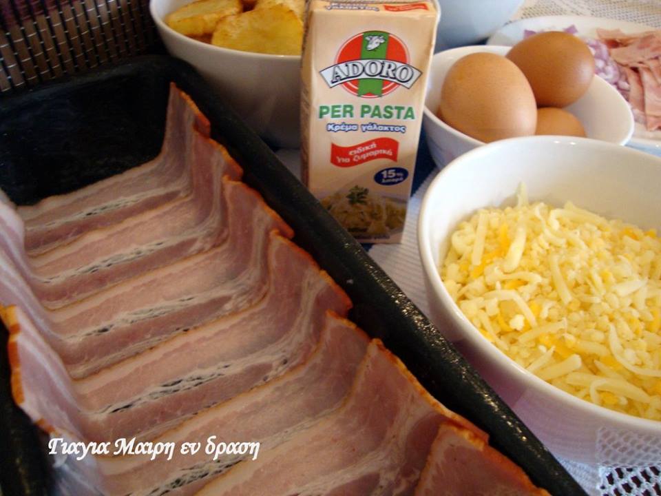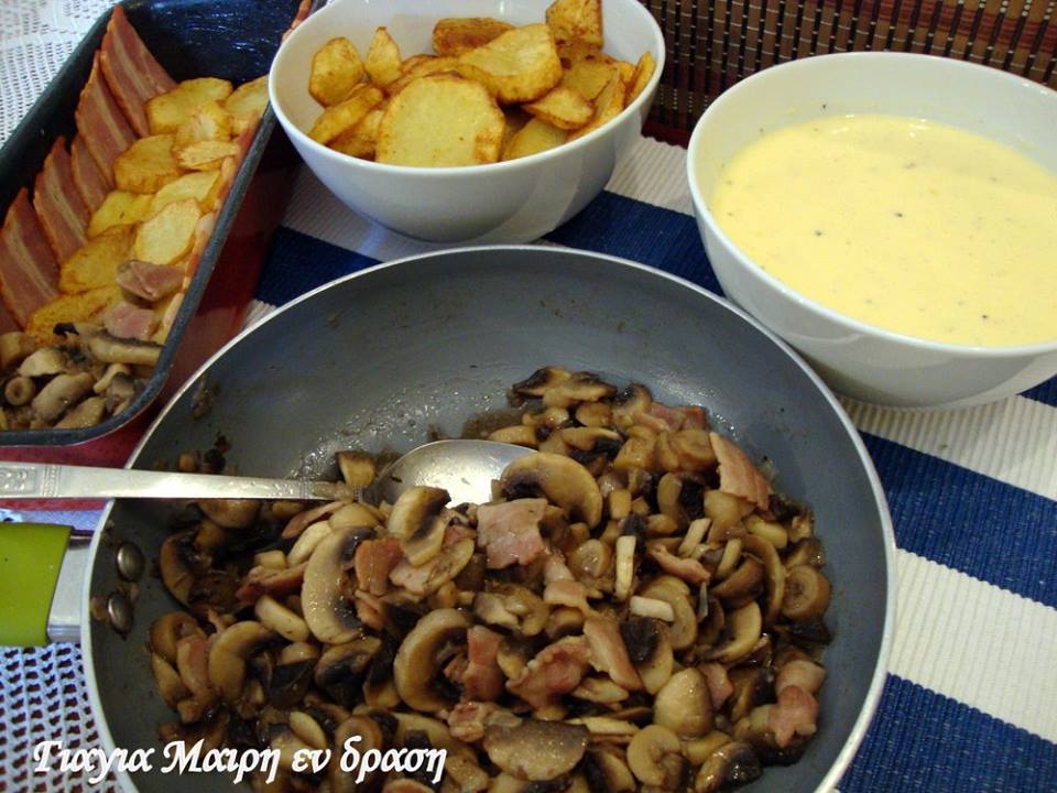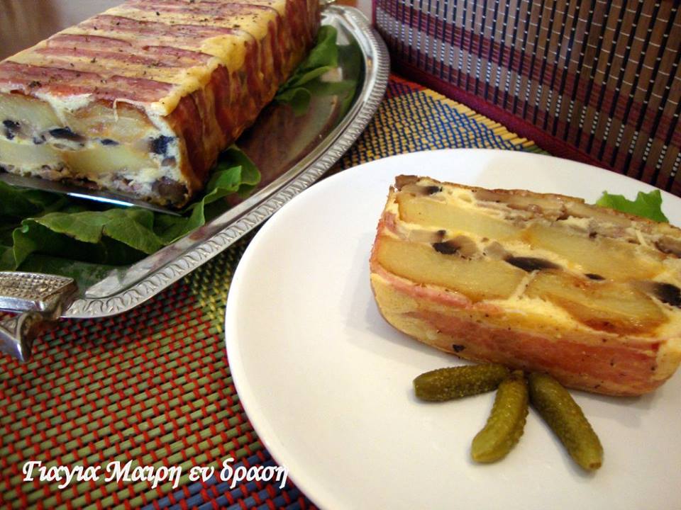 Ομελέτα φόρμας 4 πατάτες σε ροδέλες 4 αυγα 15 φέτες μπέικον 1 μεγάλο κρεμμύδι χοντροκομμένο 1/2 κεσεδάκι μανιτάρια φρέσκα χοντροκομμένα μια χούφτα κίτρινο τυρί ι μικρή κρέμα γάλακτος αλατοπίπερο 1 κσ βούτυρο ή ελαιόλαδο Εκτέλεση Κόβουμε τις πατάτες σε ροδέλες και τις τηγανίζουμε ή τις αλείφουμε με λίγο λαδάκι και τις ψήνουμε στον φούρνο. Αλείφουμε την φόρμα με βούτυρο και στρώνουμε τις μισές φέτες μπέικον. Σε ένα τηγάνι σοτάρουμε με μια κουτάλια βούτυρο ή ελαιόλαδο τα μανιτάρια το κρεμμύδι και το μπέικον και αλατάκι. χτυπάμε ελαφρώς τ’ αυγα και ρίχνουμε μέσα το τυρί την κρέμα γάλακτος και αλατοπίπερο. Βάζουμε στην φόρμα πάνω από το μπέικον μια στρώση πατάτες. από πάνω το μισό από το τηγάνι μας και το μισό μείγμα από τα αυγα και αυτό το επαναλαμβάνουμε άλλη μια φορά. στρώνουμε στην σχάρα του φούρνου μας ένα κομμάτι αλουμινόχαρτο μην τυχών και πιτσιλάει η φόρμα να μην λερωθεί ο φούρνος. Η ομελέτα δεν φουσκώνει πολύ και δεν υπάρχει περίπτωση να τρέξει. Την ψήνουμε στους 160 με 170 για μια ώρα περίπου. Μπορείτε να την ξεφορμάρετε και μόλις βγει από τον φούρνο δεν χάνει το σχήμα της.