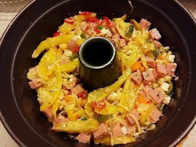 7-8 αυγά. 2-3 μέτριες πατάτες, 2 πολύχρωμες πιπεριές, φρέσκο κρεμμυδάκι, ελαιόλαδο, τυρί gouda τριμμένο, φέτα, περίπου 200γρ. Κομμένη πάριζα σε κυβάκια. Αλάτι, πιπέρι, ρίγανη.